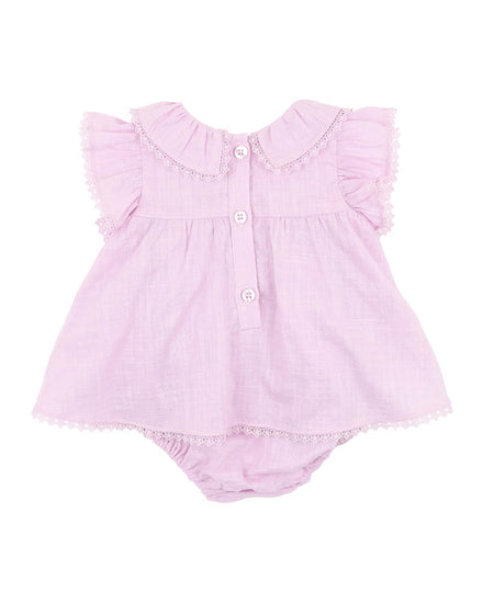 Made from breathable cotton crosshatch fabric, it features a floaty, dress-like silhouette with all the practicality of a bodysuit underneath. Delicate floral embroidery and lace trim lend a nostalgic finish, perfect for playdates, picnics or special outings.