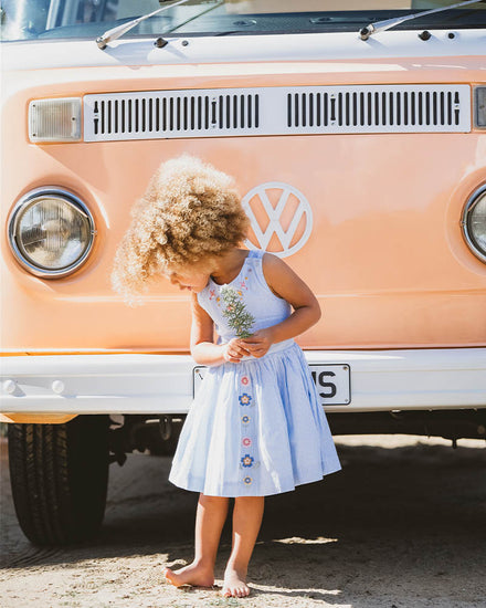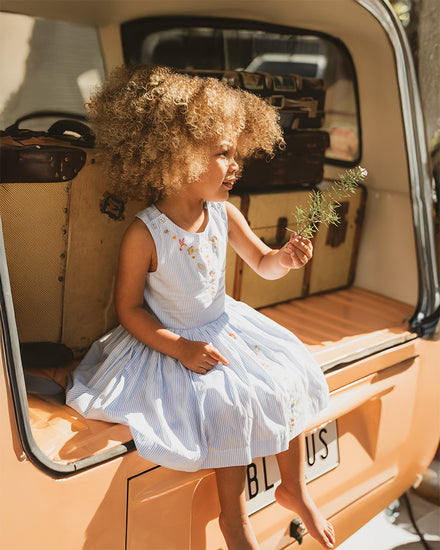 Perfect for warm-weather days and special celebrations, this embroidered dress is a fresh and cheerful addition to her wardrobe. The soft blue stripe sets off the colourful floral details, while the crossover back straps bring a playful twist to the classic silhouette. Fully lined for comfort, it's designed for twirling, exploring, and everything in between.